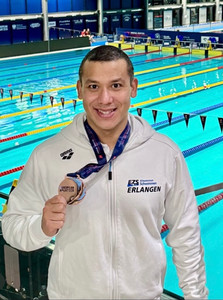 Copyright: A.v.R., J.W., N.S.N., D.S.: Bild 1: Happy nach den 200m Schmetterling v.l.n.r.: Jenny Wachsmuth, Annett von Rekowski, Carla Beckmann, Svenja Ames. Bild 2: Alfred Seeger freut sich die 200m Schmetterling mit neuem Deutschen Rekord beendet zu haben. Bild 3: Sie schwammen alle heute 400m Freistil und 200m Schmetterling und gewannen zusammen 9 Medaillen v.l.n.r. Svenja Ames, Annett von Rekowski, Carla Beckmann, Jenny Wachsmuth, Alisa Fatum-Böker. Bild 4: Nadim Seguti Nucada freut sich über Bronze